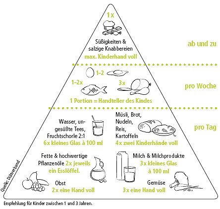 Die warme Hauptmahlzeit am Mittag sollte Nährstoffe wie Eisen, Jod, Zink und Vitamine sowie wertvolle Omega-3 und 6-Fettsäuren liefern. Wichtig sind hier pflanzliche Lebensmittel wie Kartoffeln, Reis und Hülsenfrüchte sowie reichlich Gemüse. Fleisch sollte man als Beilage sehen und nicht öfter als dreimal die Woche servieren. Ergänzend kommen Fisch und Eier einmal wöchentlich hinzu. Muss es mal schnell gehen, bieten sich Kindermenüs (auf Alterskennzeichnung achten!) an. Sie sind mild gewürzt und liefern gute Nährstoffdichte in Kleinkind gerechten Portionen.