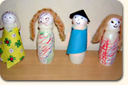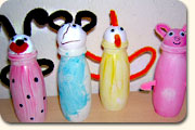 Die Fläschchen können mit Wasserfarbe, Fingerfarbe oder Filzstiften bemalt werden. Dann werden Köpfe aus gepresster Watte aufgeklebt (Bastelgeschäft oder Baumarkt) und mit Augen, Nase und Mund versehen – fertig.