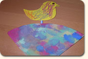 Heute wollen wir zusammen ein Vögelchen-Kuckuck-Spiel basteln.Dazu benötigen wir eine Kaffee-Filtertüte, einen Strohhalm oder Schaschlikspieß, etwas Pappe und Stifte oder Wasserfarbe.