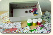 Sicherlich haben auch Sie noch einen Schuhkarton, den Sie entbehren können.Damit kann Ihr Kind heute ein tolles Bild selbst gestalten. Es fehlen nun nur noch zwei-drei Murmeln oder andere fast runde Gegenstände (Kastanien eignen sich z.B. auch), Papier und etwas Farbe. Jetzt geht es los.