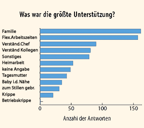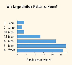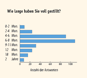 Die Rückkehr in den Beruf fand bei über 70 Prozent der Befragten zwischen der 6. Woche nach der Geburt und dem 18. Lebensmonat des Kindes statt. Besonders schnell zurück am Arbeitsplatz waren viele Frauen, die im Dienstleistungsgewerbe arbeiten. In der Regel nahmen sich die Mütter etwas mehr Zeit: die meisten der Befragten blieben 3-6 Monate zu Hause.