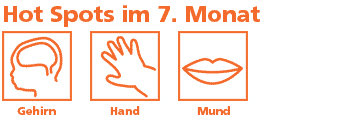 - Häufig berührt dein Baby mit seinen Händen das Gesicht oder greift nach den Füßen. Die Knospen für die bleibenden Zähne entwickeln sich.