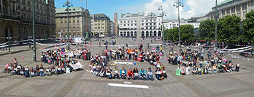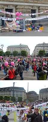 Rund 500 Frauen, Männer und Kinder haben am 26. Juni 2014 zusammen mit den Hebammen in Hamburg demonstriert. Anlass war die dort stattfindende Konferenz der Gesundheitsminister. Der Göttinger kidsgo-Verlag brachte „Die längste Nabelschnur der Welt“ mit. kidsgo hatte diese Idee zu der in Göttingen initiierten Demo im Februar entwickelt. Seitdem wurden überall in Deutschland Nabelschnurstücke mit Appellen an den Gesundheitsminister und Danksagungen an die Hebammen behängt. So unterschiedlich die „Nabelschnüre“ auch waren, die Forderungen an die Politik sind immer die Gleichen: Das Grundrecht auf eine 1:1 Betreung durch eine Hebamme vor, während und nach der Geburt und auf die freie Wahl des Geburtsorts. Dies ist nachweislich am sichersten und gesündesten für Mutter und Kind und senkt langfristig die Gesundheitskosten