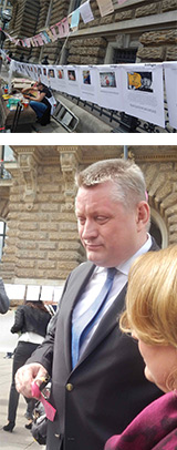 Der Bundesgesundheitsminister war kurzfristig als Gast bei der Konferenz anwesend. Inmitten des durch die Nabelschnur gerahmten Platzes nahm er nun auch endlich die von Bianca Kasting gesammelten 424.000 Change.org-Unterschriften für den Erhalt der Hebammenbegleitung offiziell entgegen. Vom Deutschen Hebammenverband, die Demo und Kundgebung organisiert hatte, bekam Herr Minister Gröhe zudem eine Landkarte der Unterversorgung überreicht. Darauf wird deutlich, dass überall Hebammen fehlen. Geburtsstationen und Geburtshäuser schließen und oft finden Frauen keine Beleghebamme mehr - es betrifft schon jetzt neben den ländlichen Bereichen auch immer mehr Städte.