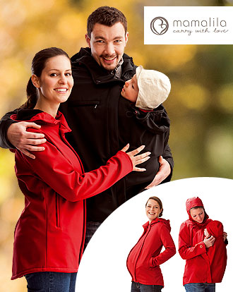 Die Allwetter-Tragejacke von mamalila ist wind- und regendicht. Es gibt sie für Mütter und Väter. Die Jacke begleitet mit einem „Baucheinsatz“ bereits durch die Schwangerschaft. Nach der Geburt schützt sie das Baby im Tragesystem oder Tuch – auf dem Rücken oder vor dem Bauch.