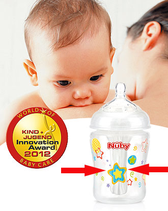 Und: Das Baby schluckt keine Luft mehr aus dem Fläschchen. Denn die Restluft in Nachfüllpack und Sauger wird vor dem Füttern ganz einfach durch Hochdrücken des Nachfüllpacks heraus gepresst. Dafür ist die Flasche unten offen. Kein Luftverschlucken - minimierte Kolik-Gefahr. Das Ergebnis: zufriedenes Baby, zufriedene Eltern. Auf der Fachmesse „Kind + Jugend“ erhielt Nûby für die Anti-Kolik-Flasche den renommierten Innovation Award 2012 im Bereich „World of Baby Care“.