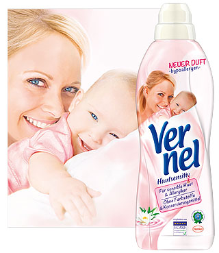 Der neue Vernel Hautsensitiv Weichspüler wurde speziell für empfindliche Haut entwickelt. Er enthält weder Farbstoffe noch Konservierungsstoffe und ist darum auch für Allergiker und Babys geeignet.
