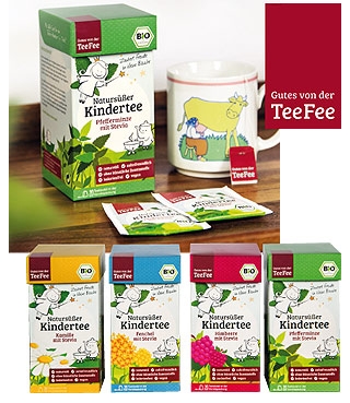 Als gesunde Alternative zu süßen Getränken bietet die TeeFee Kindertees als Durstlöscher in vier leckeren Geschmacks-richtungen an. Pfefferminz für Kinder ab 3 Jahren, Himbeer ab 12 Monaten, Fenchel und Kamille für Babys ab 6 Monaten.
