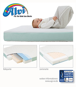 Wie man sich bettet, so schläft man. Die neue Kindermatratze Boxspring-Kids® von Alvi hat sich im anspruchsvollen Testverfahren des AGR (Aktion Gesunder Rücken e.V.) bewährt und wurde mit dem begehrten Güte zeichen „AGR geprüft & empfohlen“ ausgezeichnet.Die beidseitig nutzbare Baby- und Juniormatratze stützt den Körper punktelastisch und sorgt für gesunden Kinderschlaf. Sie ist mit einem neuartigen 3-Schicht-Kern ausgestattet. Auf der Babyseite sorgen 525 luftumspülte Federkerne für beste Durchlüftung und ein Höchstmaß an Punktelastizität.